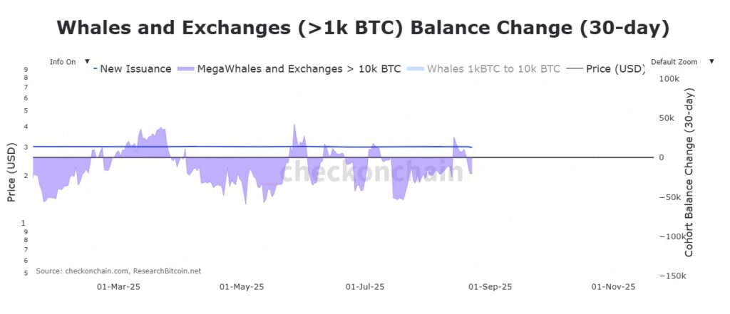 ข้อมูลจาก Checkonchain ยืนยันว่า MegaWhales (ผู้ถือครองมากกว่า 10,000 BTC) ได้ถอนเหรียญออกจากกระดานเทรดกว่า 20,360 BTC ในช่วงที่ผ่านมา แสดงให้เห็นว่าผู้เล่นรายใหญ่กำลังเดินหน้าสะสมเรื่อย ๆ