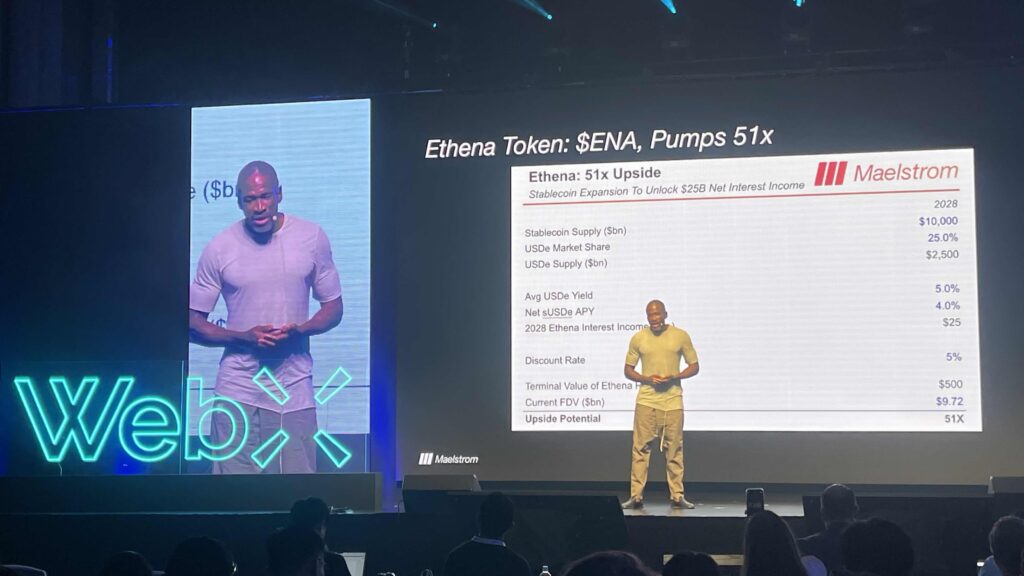 โปรเจกต์ที่สอง: Ethena (ENA) – ราชา Stablecoin องค์ใหม่ Ethena เป็น stablecoin ที่เติบโตเร็วที่สุดในตอนนี้ และ Hayes เชื่อว่า stablecoin กำลังจะเข้ามาปฏิวัติโลกการเงิน และ ENA จะกลายเป็นเสาหลักด้าน “การกู้ยืม” ใน DeFi ซึ่งเขาคาดการณ์ราคาของ ENA จะพุ่งขึ้นอีก 51 เท่าในวัฏจักรขาขึ้นรอบนี้
