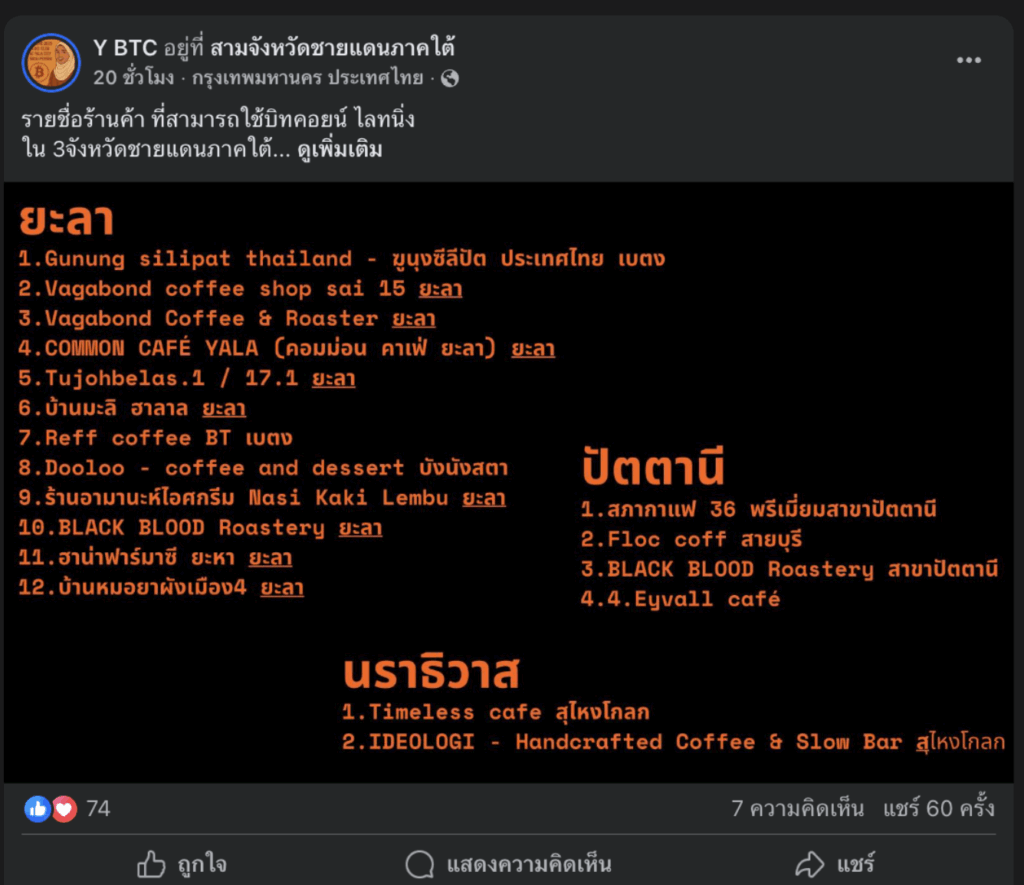 เมื่อวันจันทร์ที่ผ่านมา เพจคริปโต ‘Y BTC’ ได้เปิดเผยรายชื่อร้านค้าในสามจังหวัดชายแดนภาคใต้ที่เปิดรับชำระเงินด้วย Bitcoin Lightning Network ซึ่งข้อมูลเขียนระบุว่า ปัจจุบันมีทั้งหมด 18 ร้านค้า กระจายอยู่ในสามจังหวัดชายแดนภาคใต้ ได้แก่ ยะลา ปัตตานี และนราธิวาส
