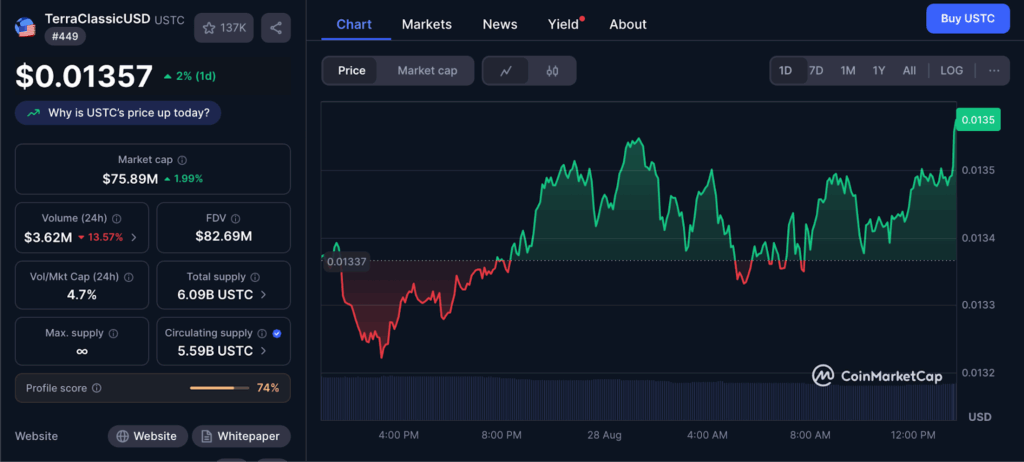 ในขณะที่รายงาน ราคา USTC กำลังซื้อขายอยู่ที่ 0.01357 ดอลลาร์ เพิ่มขึ้น 2% ภายใน 24 ชั่วโมง อ้างอิงข้อมูลจาก coinmarketcap