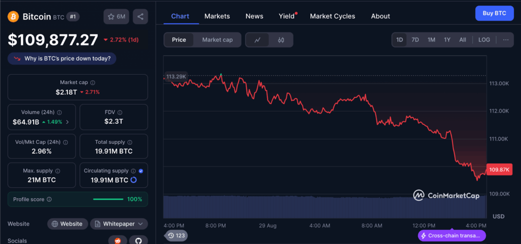 ในขณะที่รายงาน ราคา บิตคอยน์ กำลังซื้อขายอยู่ที่ 109,877 ดอลลาร์ ลดลง 2.72% ภายใน 24 ชั่วโมง อ้างอิงข้อมูลจาก coinmarketcap