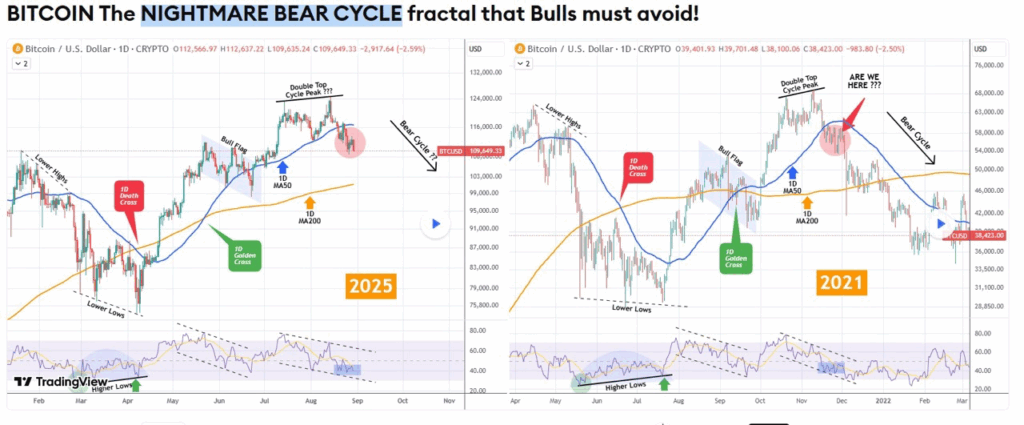 แพทเทิร์นนี้เกิดขึ้นคล้ายกับปี 2021 ในช่วงที่ Bitcoin ร่วงอย่างรุนแรง โดย TradingShot ระบุว่าหลังจาก Bitcoin ทำ All-Time High ในปีนี้ ราคา Bitcoin ก็จะร่วงเหมือนกับสิ่งที่เกิดขึ้นในปี 2021 โดยตลาดจะพบแนวรับหลังเกิด Death Cross หนึ่งวัน พร้อมสัญญาณ RSI Divergence ขาขึ้น ซึ่งนำไปสู่การดีดตัวระยะสั้น