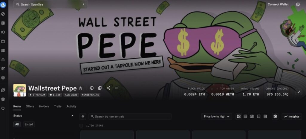 Wall Street Pepe (WEPE) จุดกระแสครั้งใหญ่ในวงการคริปโต หลังเปิดตัวคอลเลกชัน NFT แรกเมื่อวันที่ 22 สิงหาคมที่ผ่านมา กระแสตอบรับล้นหลามจากชุมชน “WEPE Army” ส่งผลให้มีการมินท์ไปแล้วกว่า 1,700 ชิ้น ในเฟสแรกของการเปิดขาย whitelist