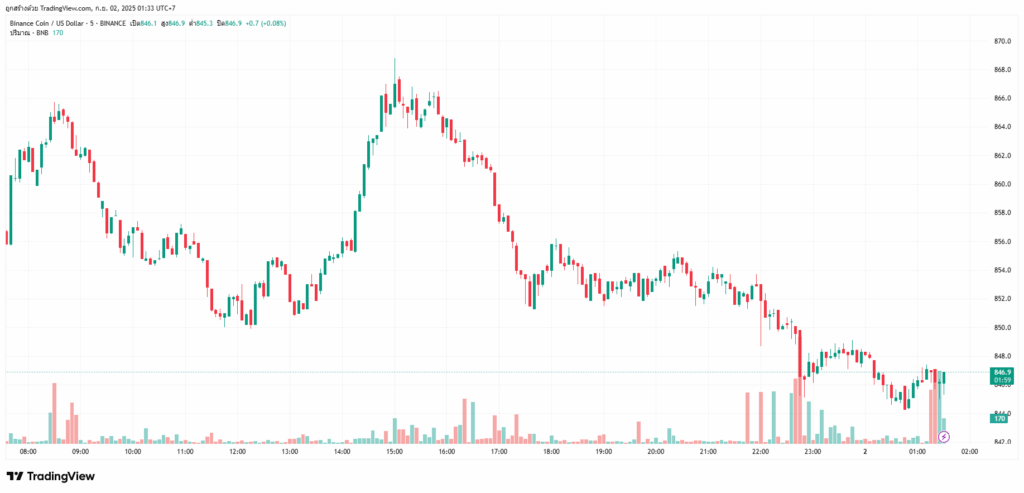 ราคา BNB แสดงความผันผวนอย่างรุนแรงในช่วง 24 ชั่วโมงที่ผ่านมา โดยร่วงลงต่ำกว่าระดับ 850 ดอลลาร์สหรัฐ ในขณะที่ยังคงปรับฐานต่อเนื่องจากจุดสูงสุดตลอดกาลที่ 900 ดอลลาร์เมื่อปลายเดือนที่แล้ว ตลาดกำลังอยู่ในภาวะระมัดระวังตัวก่อนการประกาศตัวเลขเศรษฐกิจที่สำคัญของสหรัฐฯ ในสัปดาห์นี้ ซึ่งอาจเป็นตัวชี้วัดทิศทางอัตราดอกเบี้ยของธนาคารกลางสหรัฐฯ