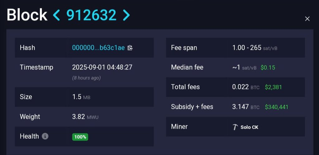 ข้อมูลเปิดเผยว่า นักขุดรายนี้ได้รับรางวัลจากการขุดบล็อก Bitcoin ณ บล็อกความสูง 912632 ผ่านระบบของ Solo CK Mining Node ในวันที่ 1 กันยายน 2025 โดยมีรายละเอียดดังนี้ :