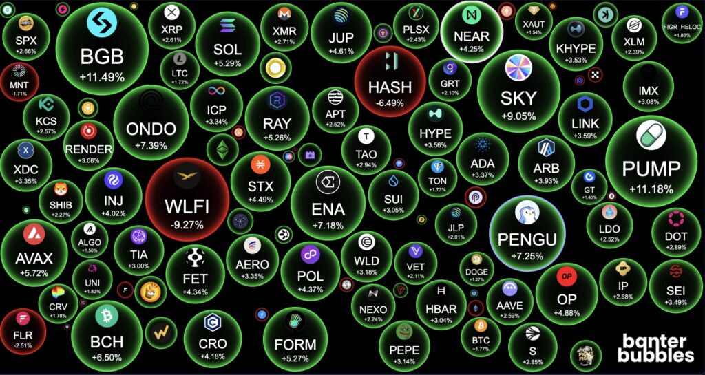 ขณะเดียวกันภาพรวมของตลาดคริปโตในวันนี้ส่วนใหญ่เคลื่อนไหวอยู่ในแดนบวก แม้จะมีบางเหรียญที่อ่อนแรงอย่าง WLFI ที่ร่วงลงแรงถึง -9.27% และ HASH ที่ปรับตัวลง -8.49% แต่บรรยากาศทั่วไปยังถือว่าดีขึ้นเมื่อเทียบกับเมื่อวานนี้ เหรียญที่โดดเด่นที่สุดฝั่งบวกได้แก่ BGB ที่พุ่งแรงถึง +11.49% ตามมาด้วย PUMP ที่บวก +11.18% และ SKY ที่เพิ่มขึ้น +9.05% ขณะที่ ENA, ONDO และ PENGU ต่างก็ทำผลงานได้ดีเช่นกัน