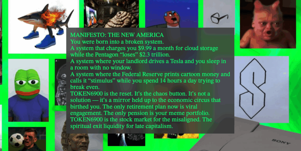 เช่นเดียวกับ SPX6900, TOKEN6900 ได้เสียดสีระบบการเงินแบบดั้งเดิม (TradFi) และพวกนายธนาคารที่แสร้งทำเป็นเสาหลักของโลกการเงิน โดย T6900 ได้แสดงให้เห็นว่า มูลค่าที่แท้จริงของเหรียญมีมนั้นอยู่ที่การจับและควบคุมความรู้สึก, เรื่องเล่า, และ “บรรยากาศ” (vibe) ที่แข็งแกร่งเท่านั้น และ T6900 ก็กำลังทำหน้าที่เป็นตัวส่งเสริมสภาพคล่องทาง “บรรยากาศ” ได้อย่างยอดเยี่ยม