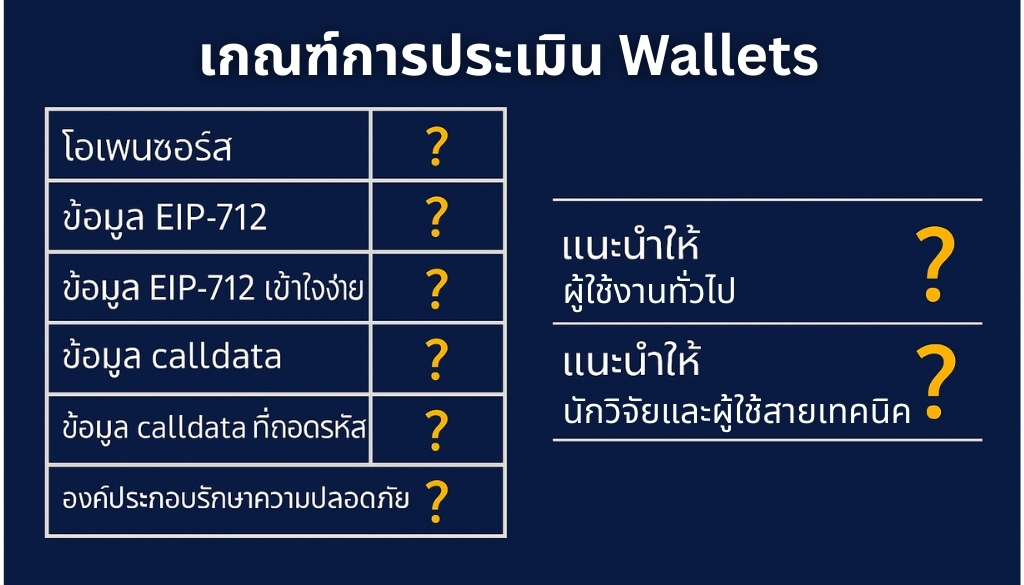 ก่อนเข้าสู่การรีวิวเชิงลึก จึงได้มีการกำหนด เกณฑ์การทดสอบที่ชัดเจน ไม่ว่าจะเป็นการแสดงผลธุรกรรม (visibility of calldata), ความเป็น open source และ reproducible ของซอฟต์แวร์ รวมถึงฟีเจอร์ด้านความปลอดภัยของฮาร์ดแวร์ เพราะหาก wallet ไม่สามารถทำหน้าที่หลักในการปกป้อง private key ได้ ก็ถือว่าตกรอบตั้งแต่แรก