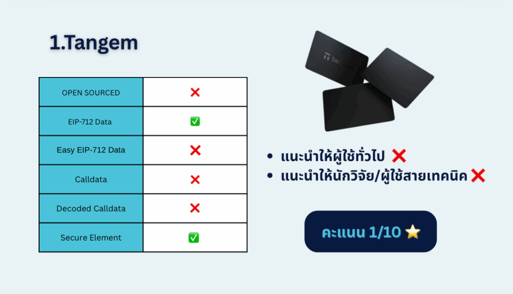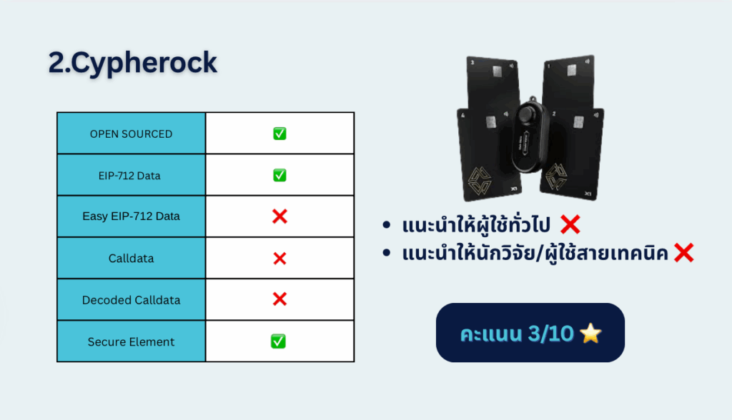 - จุดแข็ง: มี secure element (EAL6+), แสดงข้อมูลครบทุกธุรกรรม, โค้ด reproducible ได้จริง