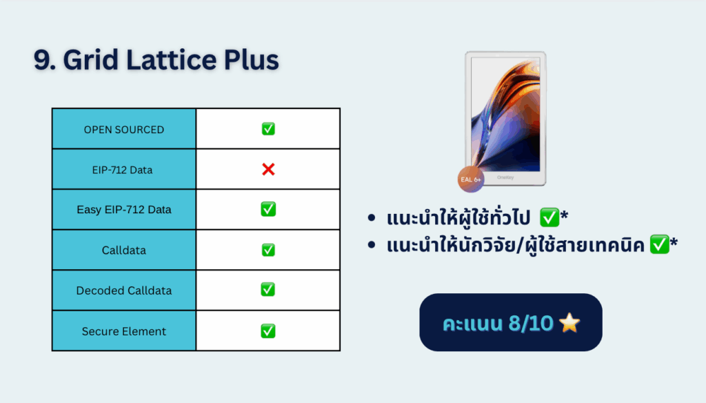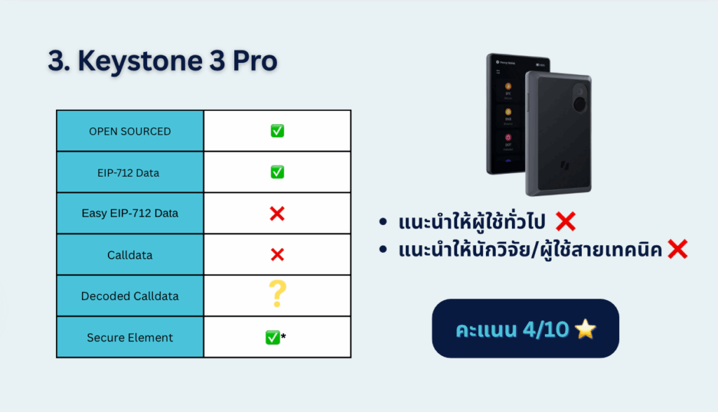 - จุดอ่อน: ไม่มี secure element ทำให้ไม่แข็งแรงพอในระยะยาว, raw calldata format อ่านยาก