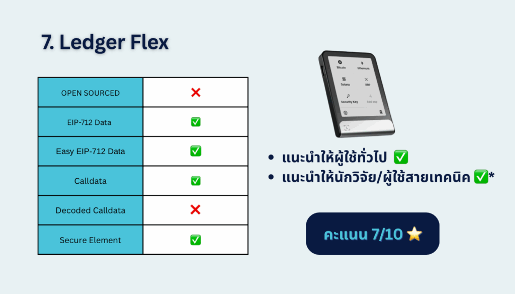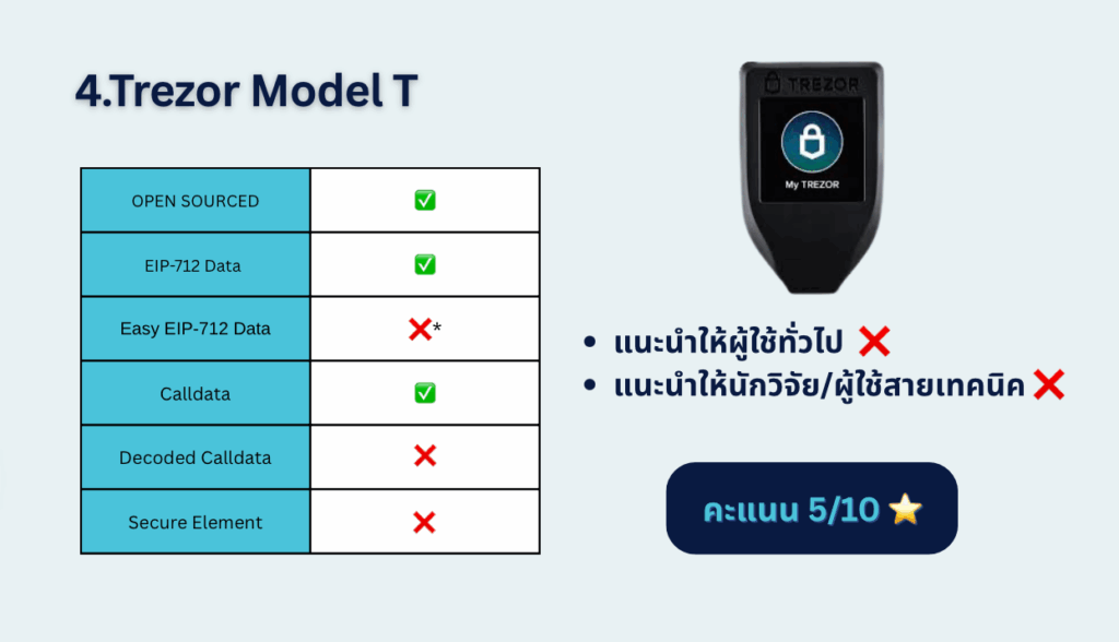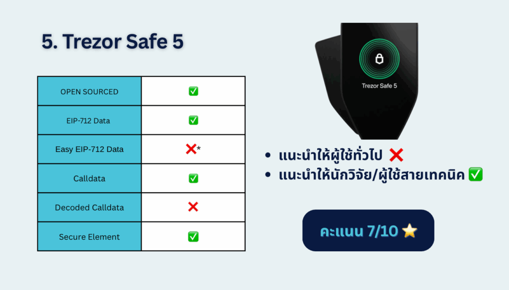 - ถ้าให้ความสำคัญกับ open source → Trezor Safe 5 ถือว่าสมดุลที่สุด แม้ผู้ใช้ยังต้องตรวจสอบ calldata เองอยู่บ้าง