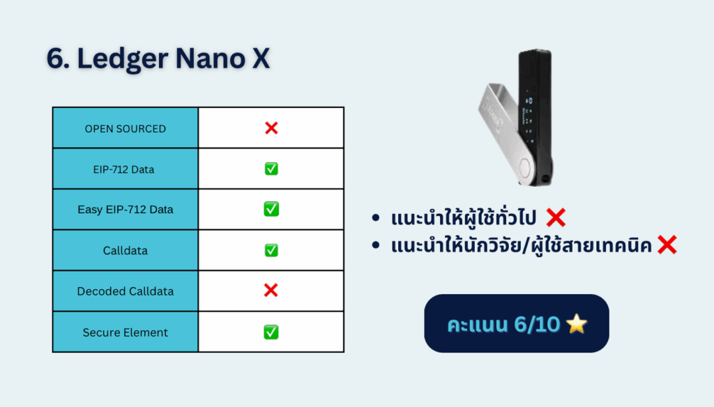 - จุดแข็ง: แสดง domain hash และ message hash ได้ดีมาก, usability สูงกว่า Nano X