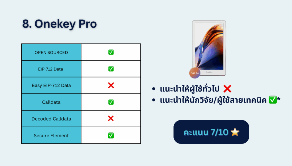- จุดแข็ง: UI ยอดเยี่ยม, secure element มาตรฐานสูง, การแสดงผลข้อมูลชัดเจนที่สุด