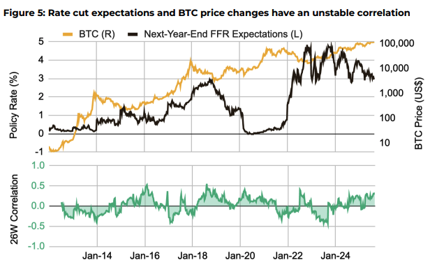 Binance Research ตั้งข้อสังเกตว่า ความสัมพันธ์ระหว่างราคาของ Bitcoin และการคาดการณ์อัตราดอกเบี้ยของ Fed นั้น ทั้งต่ำและมีความผันผวนสูง ความสัมพันธ์ระหว่างราคาสินทรัพย์ทั้งสองมีความซับซ้อนกว่าที่เห็น