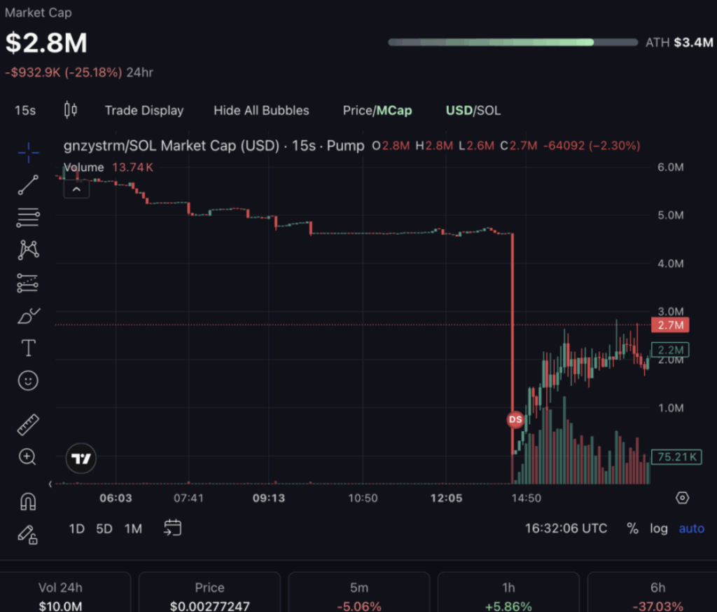 การกดผิดพลาดบนมือถือครั้งเดียว ทำเอาราคาเหรียญ “gnzystrm” ดิ่งวูบจากมูลค่าตลาด 4.6 ล้านดอลลาร์ ลงไปต่ำถึง 12,000 ดอลลาร์ในไม่กี่วินาที ก่อนจะฟื้นตัวกลับมาอยู่ที่ราว 2.2 ล้านดอลลาร์ ในปัจจุบัน