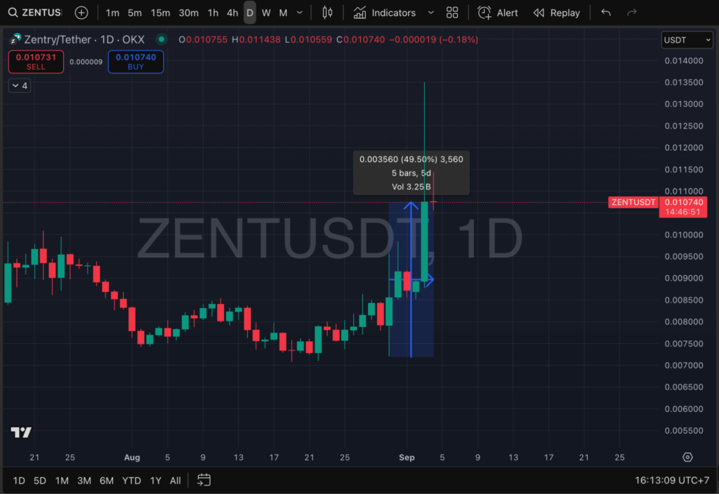 ปัจจัยสำคัญที่ทำให้ ZENT พุ่งขึ้นในครั้งนี้ มาจากการประกาศของ Binance Alpha ที่เปิดตัว Zentry โดยการลิสต์เหรียญ ZENT อย่างเป็นทางการ พร้อมกับการจัดการแข่งขันเทรด Zentry บนแพลตฟอร์ม Binance Alpha เมื่อวันที่ 30 สิงหาคม 2025 โดยมี รางวัลรวมมูลค่าสูงถึง 800,000 ดอลลาร์สหรัฐฯ หรือ 96.2 ล้าน ZENT