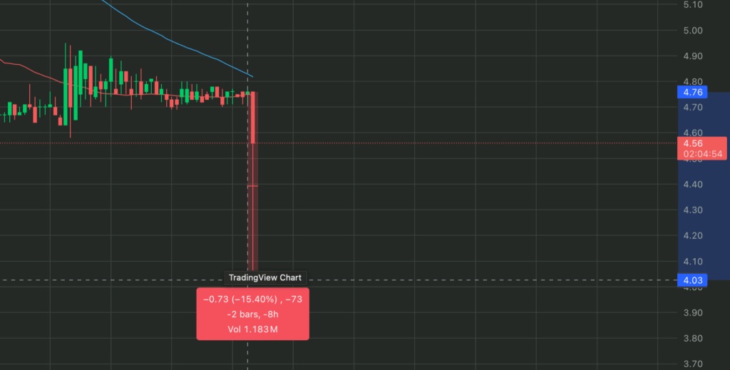 นอกจากการปรับฐานระยะยาวแล้ว ราคาของ JFIN ยังร่วงแรงกว่า 15% ภายใน 8 ชั่วโมงในวันนี้ โดยการร่วงในครั้งนี้มาพร้อมกับ Volume ซื้อขายที่พุ่งทะลุ 1.18 ล้านเหรียญ ซึ่งสูงผิดปกติเมื่อเทียบกับช่วงก่อนหน้า สะท้อนแรงขายจากนักลงทุนรายใหญ่หรือการเทขายพร้อมกันในปริมาณมาก