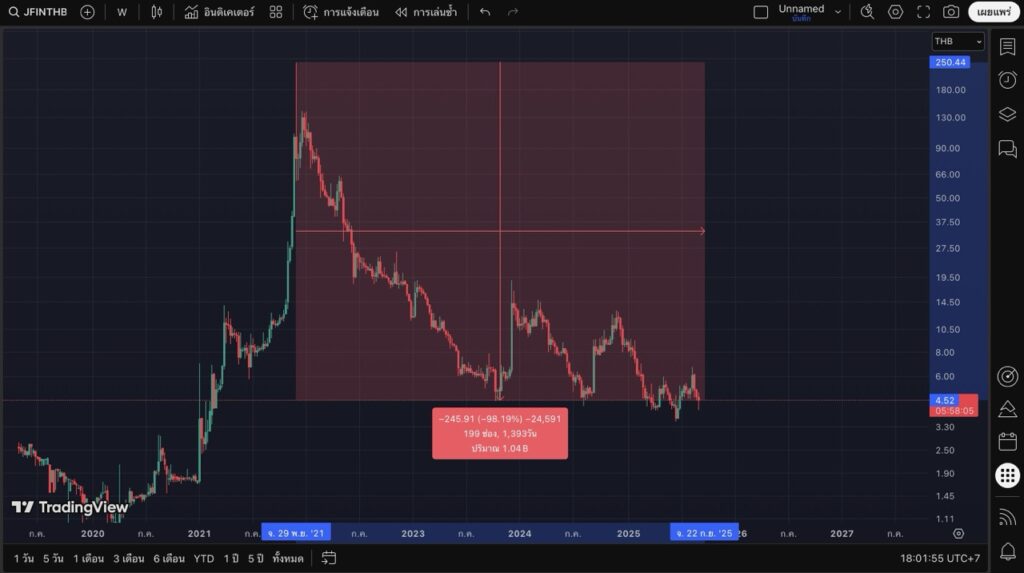 ราคาของ JFIN ดิ่งลงจาก 250 บาท เหลือ 4.52 บาท ภายใน 3 ปี คิดเป็นการร่วงกว่า 98% หากราคาไม่สามารถยืนเหนือ 4.70 – 4.80 บาท ได้ อาจร่วงลงไปทดสอบแนวรับถัดไปบริเวณ 4.00 บาท
