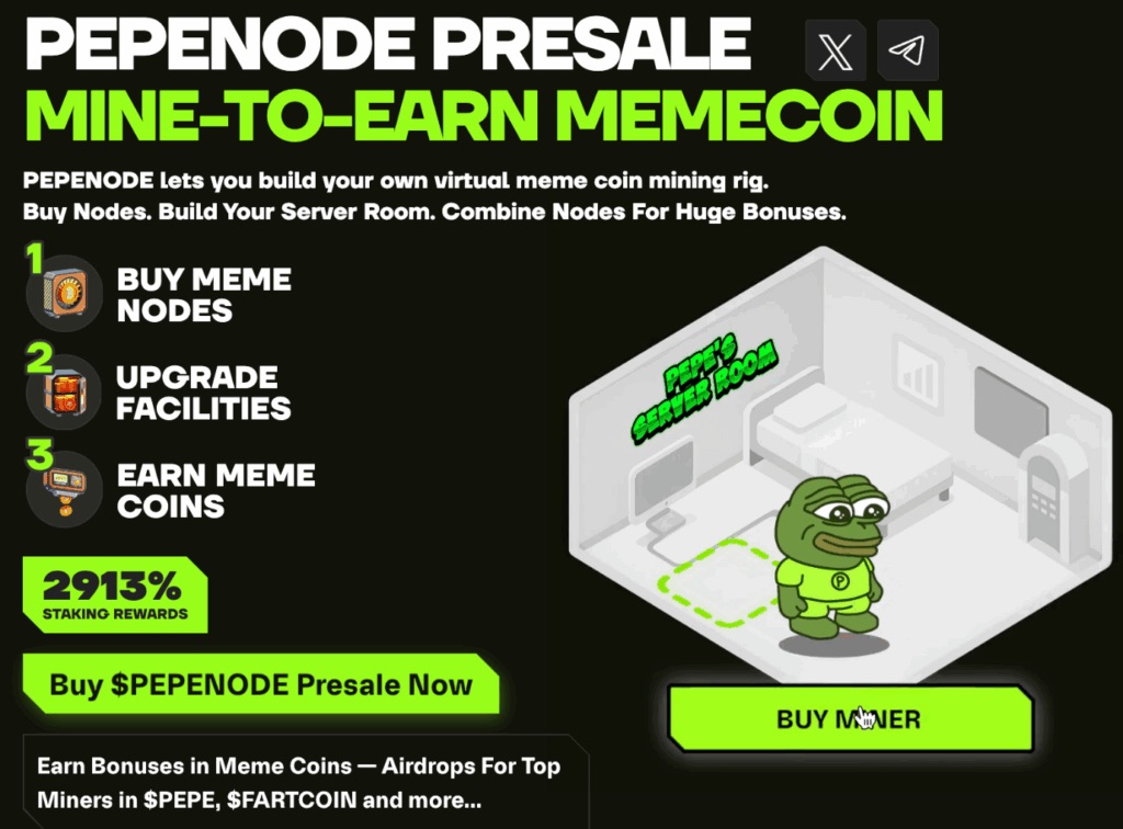 อีกหนึ่งโปรเจคที่มาแรงตามกระแส MemeCore คือ PepeNode (PEPENODE) เหรียญมีมแนว Mine-to-earn ที่ผสานระบบ “การขุดเสมือนจริงแบบ gamified mining” โดยผู้ใช้งานสามารถซื้อ Meme node, อัปเกรดสิ่งปลูกสร้าง และรับรางวัลเป็นโทเค็น PEPENODE