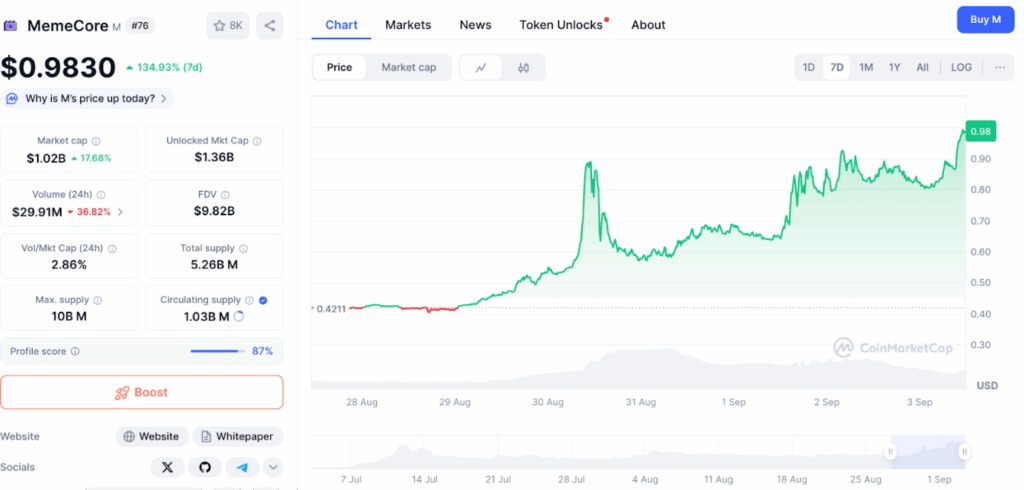 MemeCore (M) โปรเจคบล็อกเชน Layer-1 ที่สร้างขึ้นเพื่อรองรับ “Meme 2.0” กำลังเป็นที่จับตาอย่างมาก โดยล่าสุด ราคาพุ่งขึ้น 16% อยู่ที่ 0.9672 ดอลลาร์ และทำสถิติ เพิ่มขึ้นกว่า 126% ภายใน 7 วัน ส่งผลให้ Market Cap ทะลุ 1 พันล้านดอลลาร์สหรัฐฯ แล้ว โดยอ้างอิงข้อมูลจาก CoinMarketCap
