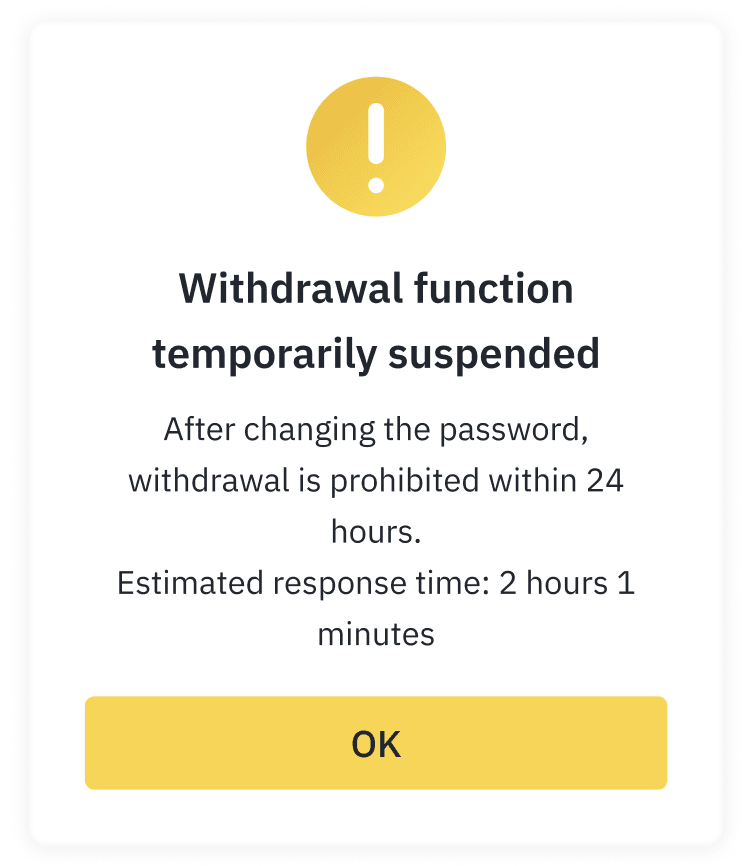 หากคุณเพิ่งเปลี่ยนรหัสผ่าน, รีเซ็ตการยืนยันตัวตนแบบ 2FA, เปลี่ยนอุปกรณ์ที่ใช้เข้าสู่ระบบ หรือทำผิดนโยบายของแพลตฟอร์ม ระบบอาจระงับการถอนเงินของคุณไว้ชั่วคราวเป็นเวลา 24-48 ชั่วโมงเพื่อความปลอดภัย โปรดตรวจสอบการแจ้งเตือนในหน้า Security ของบัญชีคุณเพื่อดูข้อมูลเพิ่มเติมในส่วนนี้