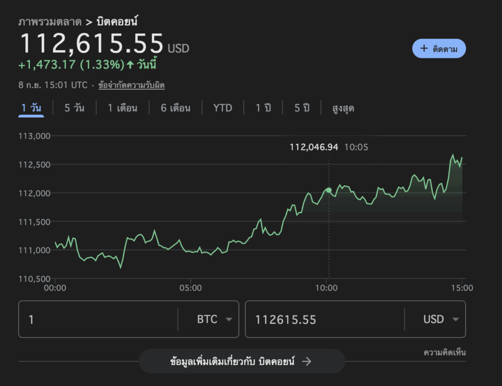 วันที่ 8 กันยายน 2025 ตลาด Bitcoin (BTC) เริ่มส่งสัญญาณฟื้นตัว หลังจากเช้าตลาดเปิดที่ 111,979 ดอลลาร์ ล่าสุดเวลา 22:01 น. ราคาเคลื่อนไหวขึ้นมาแตะ 112,615 ดอลลาร์ เพิ่มขึ้น 1.33% ภายในวันเดียว มูลค่าตลาดรวมอยู่ที่กว่า 2.23 ล้านล้านดอลลาร์ พร้อมปริมาณการซื้อขาย 24 ชั่วโมงราว 28.57 พันล้านดอลลาร์