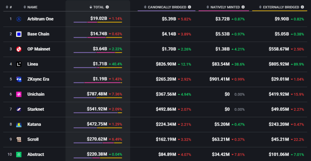 ปัจจุบัน L2 ได้รับความสนใจอย่างมากจากนักลงทุนและผู้ใช้งานอย่างจริงจัง ดังจะเห็นได้จากมูลค่าสินทรัพย์ที่ถูกล็อกอยู่ในระบบ (TVS) ที่สูงมาก เช่น Arbitrum (~$1.9 หมื่นล้าน ), Base (~$1.4 หมื่นล้าน), และ Optimism (~$3.6 พันล้าน)