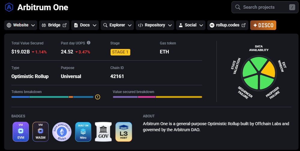 สิ่งที่หลายคนสนใจคือ “ตัวเลขจริง” ณ ตอนนี้ L2 ใหญ่ ๆ กำลังโตแค่ไหน? ถ้าดูมูลค่าสินทรัพย์ที่ถูกล็อก/ค้ำประกันบนเครือข่าย (TVS/TVL) จะเห็นว่า Arbitrum One มีทรัพย์สินที่ถูกล็อคบนเครือข่ายกว่า 1.9 หมื่นล้านดอลลาร์ และจัดอยู่ใน Stage 1 สื่อถึงความสุกงอมของสถาปัตยกรรมและการกำกับดูแลในระดับหนึ่ง