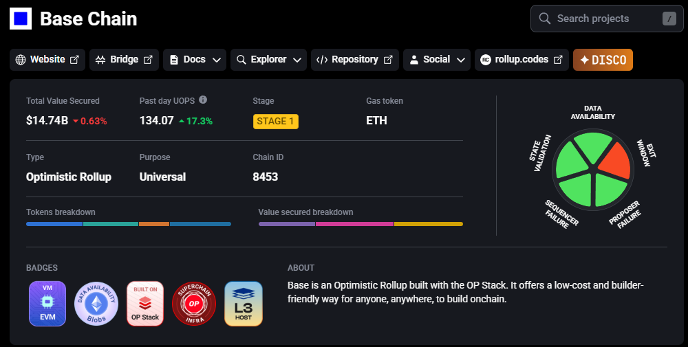 ขณะที่ Base ซึ่งสร้างบน OP Stack ของ Optimism กำลังเติบโตอย่างรวดเร็ว โดยมีมูลค่าสินทรัพย์รวมที่ถูกล็อกไว้ (TVS) สูงถึงประมาณ 1.4 หมื่นล้านดอลลาร์ และอยู่ใน Stage 1 เช่นกัน
