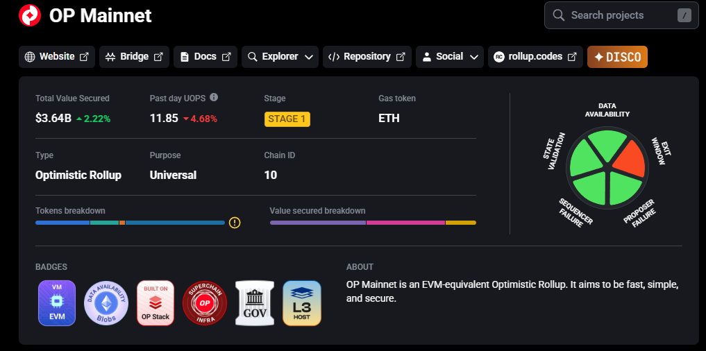 ด้าน OP Mainnet (Optimism) เองมี TVS ประมาณ 3.62 พันล้านดอลลาร์ และอยู่ใน Stage 1