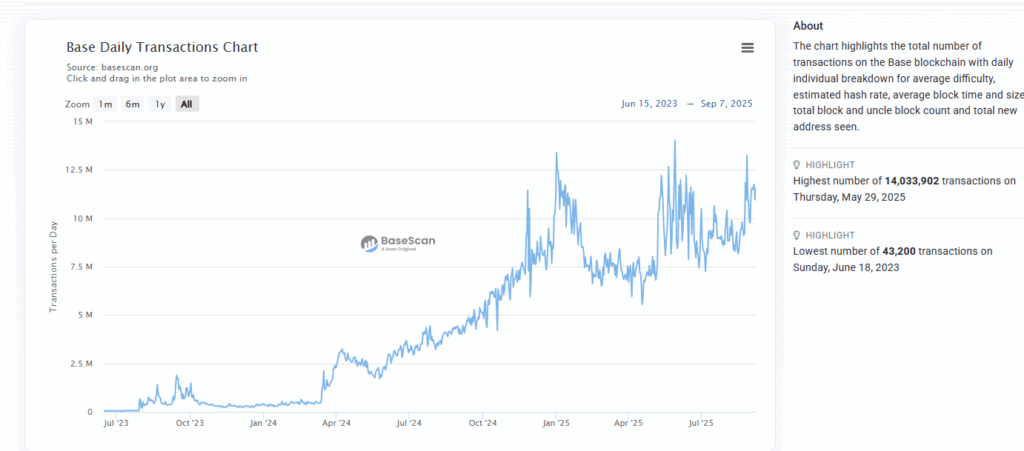 โดย Base ได้สร้างสถิติที่น่าประทับใจด้วยจำนวนธุรกรรมรายวันสูงสุดถึง 14,033,902 ครั้ง เมื่อวันที่ 29 พฤษภาคม 2025 ซึ่งเป็นตัวเลขที่สะท้อนถึงความต้องการใช้งานที่สูงมาก