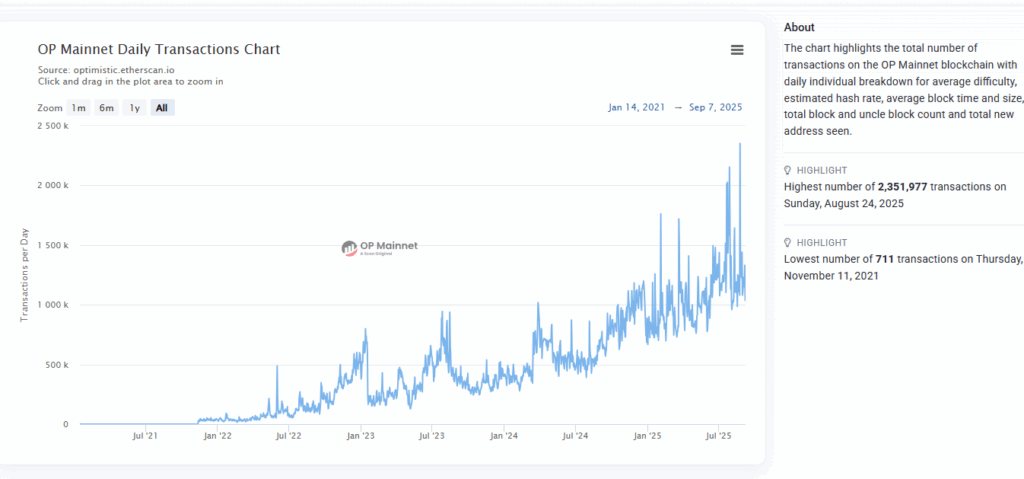 ในขณะที่ Optimism (OP) ทำสถิติธุรกรรมสูงสุดไป เมื่อวันที่ 24 สิงหาคม 2025 Optimism (OP) และได้ทำลายสถิติธุรกรรมสูงสุดรายวันด้วยจำนวน 2,351,977 รายการ ซึ่งเป็นสถิติใหม่ของเครือข่าย