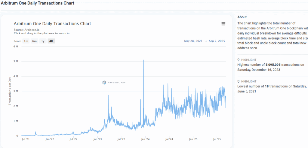 อย่างไรก็ตาม ในปี 2025 ปริมาณธุรกรรมรายวันของ Arbitrum กลับค่อย ๆ ลดลง โดยในช่วง เดือนกรกฎาคม 2025 มียอดธุรกรรมเฉลี่ยประมาณ 900,000 รายการต่อวัน แม้ปริมาณธุรกรรมจะลดลง แต่ Arbitrum ยังคงเป็นผู้นำในด้านการสร้างรายได้จาก ค่าธรรมเนียมการทำธุรกรรม โดยมีส่วนแบ่งตลาดประมาณ 5–10% ของเครือข่าย Layer-2 ทั้งหมด