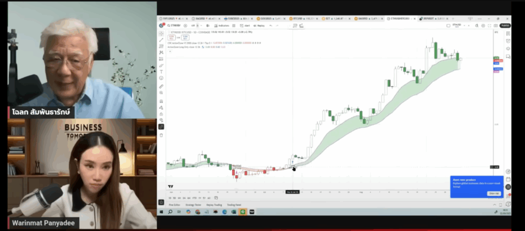 ในการพูดคุยในรายการ Business Tomorrow ทางช่อง YouTube Trader KP เมื่อวันที่ 2 กันยายนที่ผ่านมา ลุงโฉลกได้ให้ความเห็นว่าในช่วงที่ตลาดเป็นขาขึ้น นักลงทุนหลายคนมักจะตัดสินใจไม่ได้ว่าจะเข้าซื้อ Bitcoin หรือ Ethereum ดี โดยคำแนะนำของลุงโฉลกคือ ให้นำกำลัง (Momentum) ของทั้งสองเหรียญมาเปรียบเทียบกัน เพื่อประกอบการตัดสินใจ