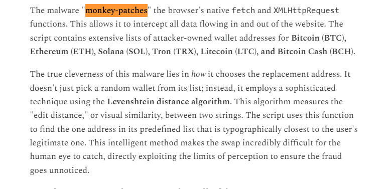 มัลแวร์ที่ถูกฝังไว้นี้ ทำงานเป็น Crypto-Clipper โดยจะคอยดักจับธุรกรรม Web3 ที่เกิดขึ้นบนเบราว์เซอร์ แล้วทำการเปลี่ยนที่อยู่กระเป๋าสตางค์ของผู้รับให้เป็นของแฮ็กเกอร์ในทันที ทำให้ผู้ใช้งานแทบจะไม่มีทางรู้เลยว่า เงินของตนกำลังจะถูกโอนไปยังปลายทางที่ผิดพลาด