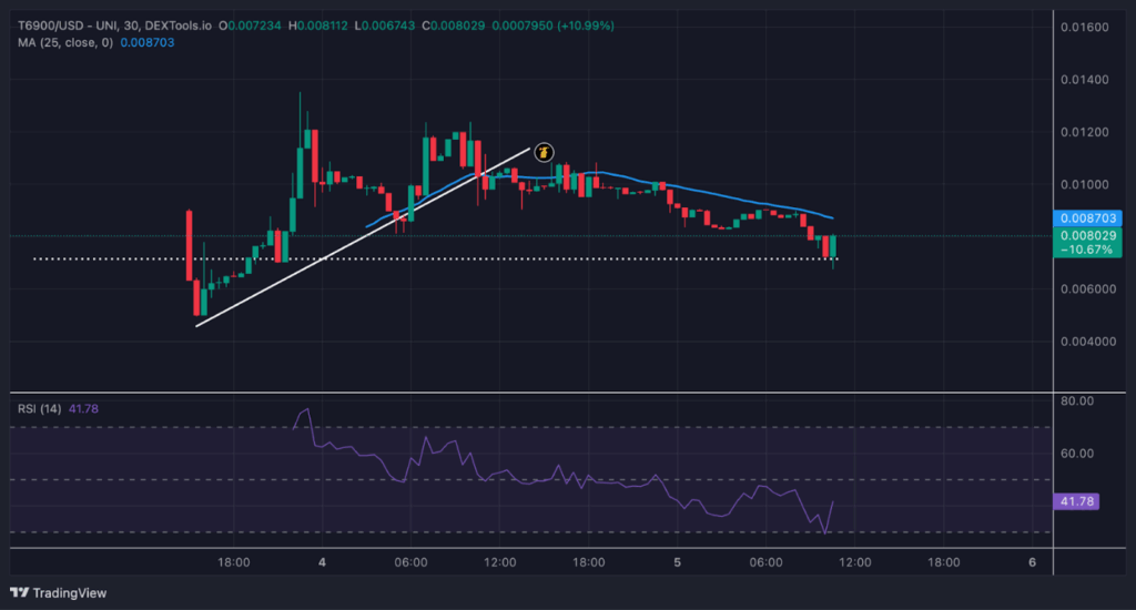 ด้วยแนวคิดที่เสียดสีระบบการเงินดั้งเดิมและวัฒนธรรม “degen” แนวคิดที่ยอมรับความเสี่ยงในระดับสูงเพื่อแลกกับผลตอบแทนมหาศาล เหรียญ T6900 ได้รับการวางตำแหน่งให้เป็นผู้สืบทอดจาก SPX6900 โดยมีเป้าหมายในการสร้างและเติมเต็ม Vibe liquidity ให้กับโลกการเงินยุคใหม่ แม้ว่าราคาจะร่วงลงจากจุดสูงสุดที่ $0.013 แต่การยืนเหนือราคาเปิดตัวที่ $0.00715 ได้อย่างแข็งแกร่ง แสดงให้เห็นถึงการสะสมพลังครั้งใหญ่ที่อาจนำไปสู่การพุ่งขึ้นครั้งใหม่ได้ทุกเมื่อ