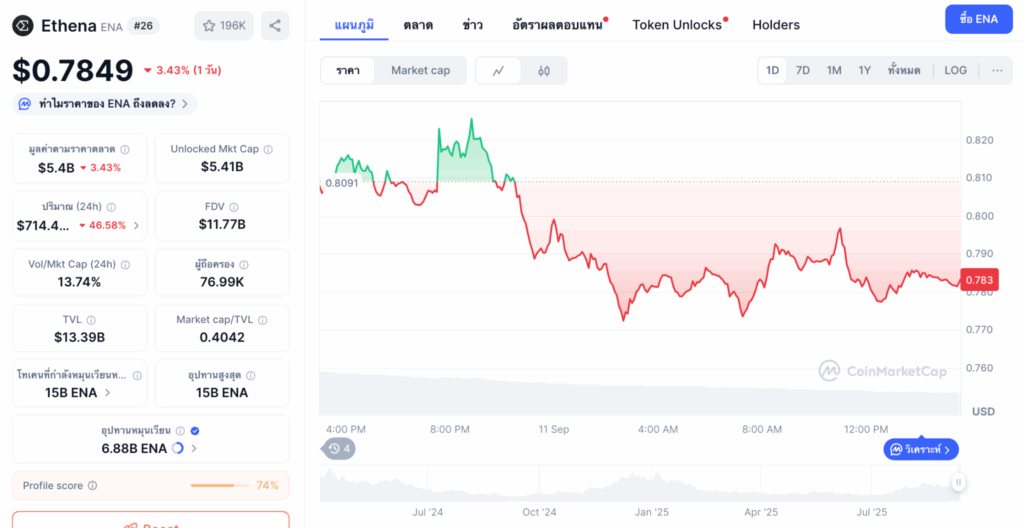 ในขณะที่รายงาน Ethena (ENA) มีการซื้อขายกันอยู่ที่ $0.7849 ร่วงลง 3.43% ช่วง 24 ชั่วโมงที่ผ่านมา ตามข้อมูลจาก CoinMarketCap