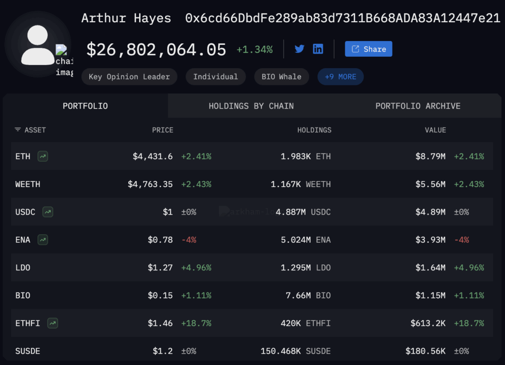 ข้อมูลจาก Arkham Intelligence ระบุว่า Hayes เข้าเก็บสะสม ENA หลายครั้ง โดยเมื่อวันพุธที่ผ่านมา เขาซื้อเพิ่มกว่า 578,956 ENA มูลค่าราว 473,000 ดอลลาร์ และก่อนหน้านี้ได้เข้าซื้ออีกสองครั้งรวมกว่า 672,800 ENA หรือราว 521,000 ดอลลาร์ ทำให้ยอดเข้าซื้อรวมตลอดสัปดาห์กลายเป็น 995,000 ดอลลาร์