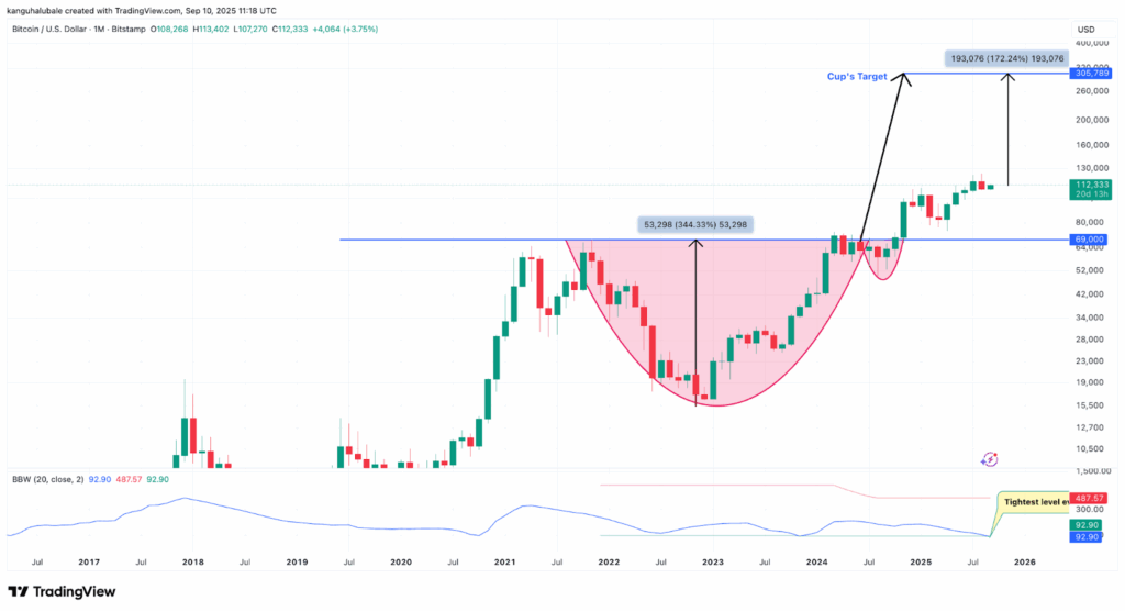ปัจจุบัน กราฟรายเดือนแสดงให้เห็นว่าราคา Bitcoin ได้พุ่งทะลุแนว neckline ของแพทเทิร์น Cup-and-Handle ที่ $69,000 ในเดือนพฤศจิกายน 2024 ซึ่งราคาอาจปรับตัวขึ้นเพื่อไปต่อให้ถึงระยะทางสูงสุดระหว่างจุดต่ำสุดของ Cup กับ neckline