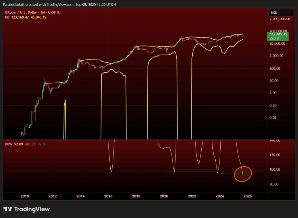 Matthew Hyland นักวิเคราะห์คริปโต กล่าวว่า ขณะนี้ Bollinger Bands เครื่องมือที่ใช้ในการวัดโมเมนตัม และความผันผวนของกราฟราคา Bitcoin รายเดือน กำลังบีบตัวแคบที่สุด (Extreme) ระดับที่เรียกได้ว่าแทบจะรุนแรงในประวัติศาสตร์