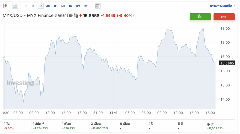 เหรียญ MYX Finance (MYX) กลายเป็นดาวเด่นที่ถูกพูดถึงมากที่สุดในตลาดคริปโตช่วงสองเดือนที่ผ่านมา ราคาพุ่งจากเพียง $0.047 ในเดือนมิถุนายน 2025 ทะยานขึ้นแตะจุดสูงสุดกว่า $17 ภายในต้นกันยายน คิดเป็นการเพิ่มขึ้นกว่าประมาณ 20,000%ในวันที่ 9 กันยายนเพียงวันเดียว ราคายังบวกแรงถึง 291% พร้อมด้วยปริมาณซื้อขายทะลุ $880 ล้าน และมูลค่าตลาดพุ่งเกิน $3.5 พันล้าน ขึ้นมาติดอันดับ Top 35 ของโลกในชั่วข้ามคืน