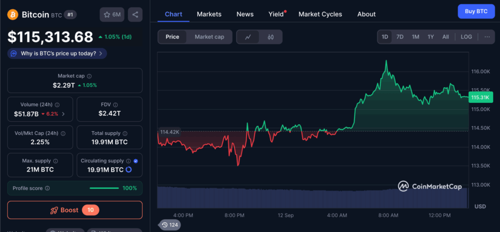 ในขณะที่รายงาน ราคา  Bitcoin  กำลังซื้อขายอยู่ที่ 115,313.68 ดอลลาร์ เพิ่มขึ้น 1.05% ภายใน 24 ชั่วโมง อ้างอิงข้อมูลจาก coinmarketcap