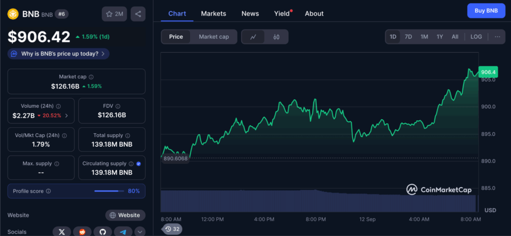 ในขณะที่รายงาน ราคา BNB กำลังซื้อขายอยู่ที่ 906.42% เพิ่มขึ้น 1.59% ภายใน 24 ชั่วโมง อ้างอิงข้อมูลจาก coinmarketcap