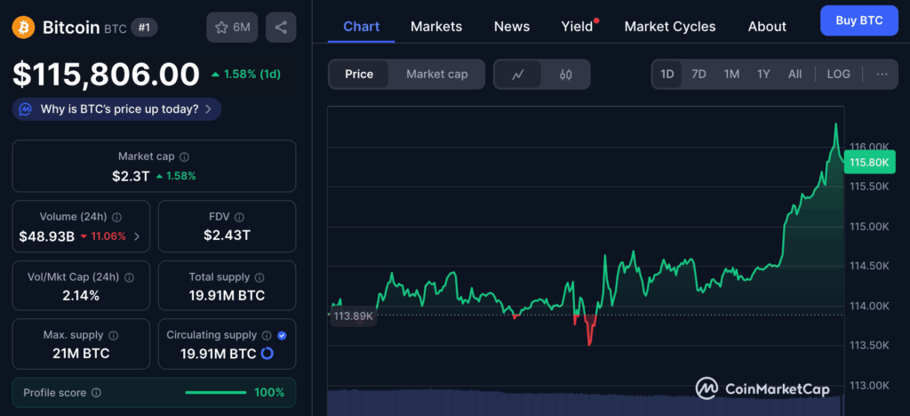 อ้างอิงข้อมูลจากกราฟ BTC/USD บน Coinmarketcap ราคาบิทคอยน์ (BTC-USD)ได้พุ่งขึ้นอย่างมีนัยสำคัญถึง 1.6% ในช่วง 24 ชั่วโมงที่ผ่านมา จากระดับประมาณ 113,000 ดอลลาร์สหรัฐมาอยู่ที่ 116,000 ดอลลาร์สหรัฐ