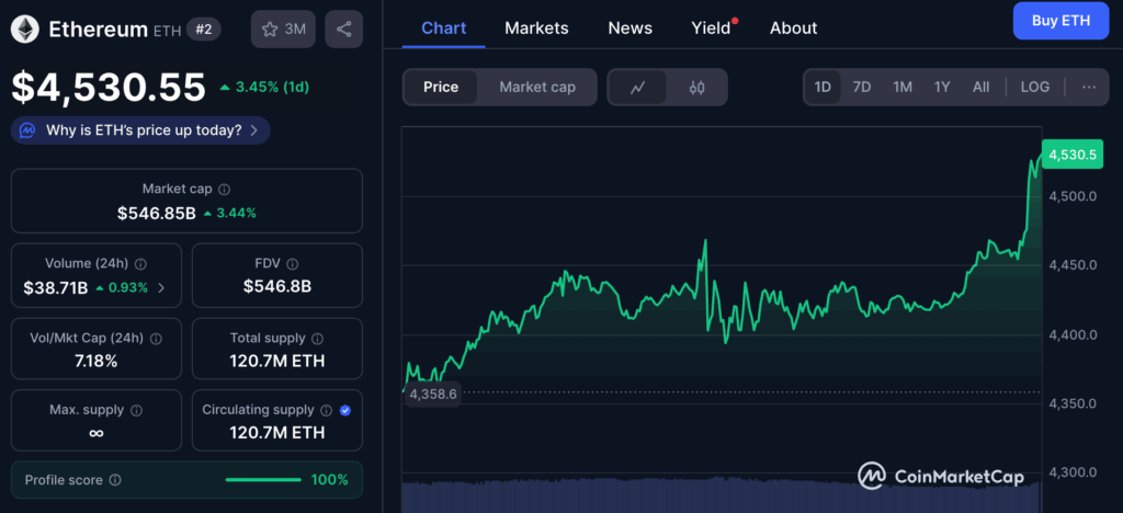 ขณะเดียวกันคู่เทรด ETH/USD ก็ปรับตัวพุ่งขึ้นเช่นกันและรุนแรงกว่าฝั่งของบิทคอยน์ โดยทำราคาขึ้นมา 3.41% จากราคา $4,300 มายัง $4,500