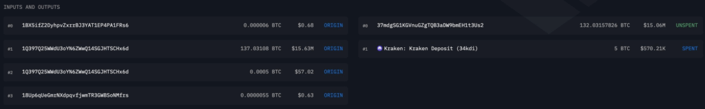 - 132.03 BTC (มูลค่าประมาณ 15.6 ล้านดอลลาร์) ถูกโอนไปยังที่อยู่ใหม่
