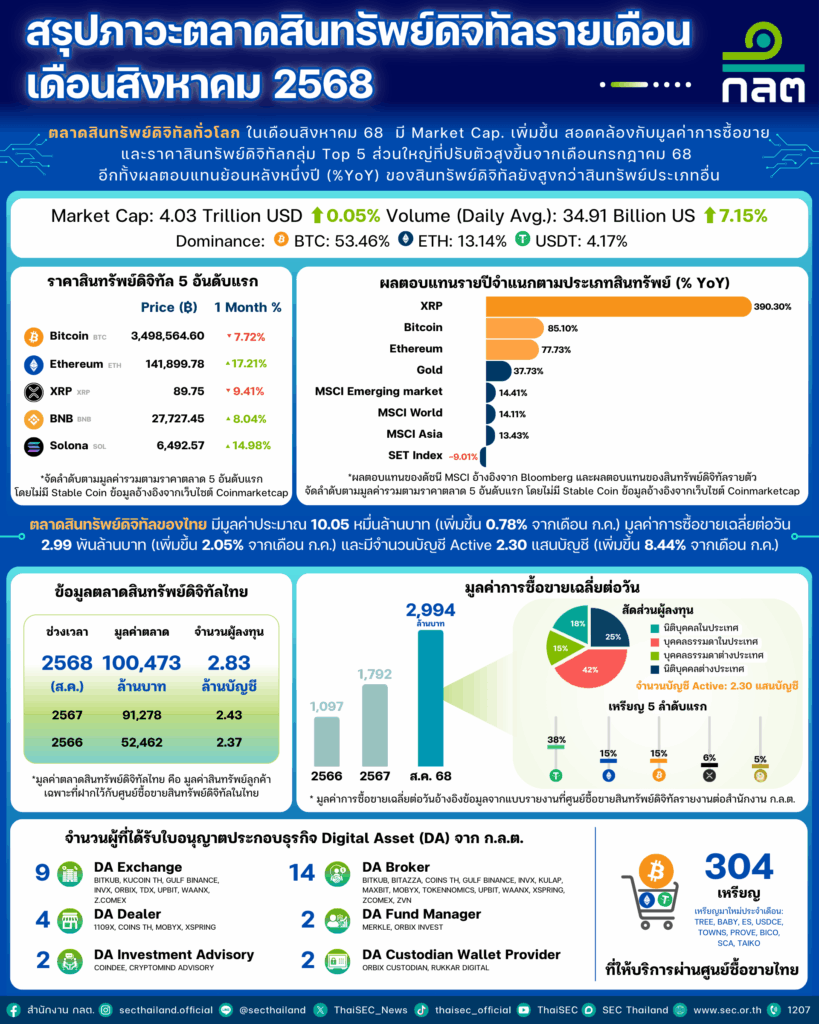 สำหรับภาพรวมตลาดสินทรัพย์ดิจิทัลทั่วโลก ในเดือนสิงหาคม 2568 Market Cap ของตลาดคริปโตทั่วโลกอยู่ที่ 4.03 ล้านล้านดอลลาร์สหรัฐ เพิ่มขึ้น 0.05% จากเดือนกรกฎาคม โดย Bitcoin ยังคงครองส่วนแบ่งตลาดสูงสุดที่ 53.46% จากมูลค่าตลาดทั้งหมด