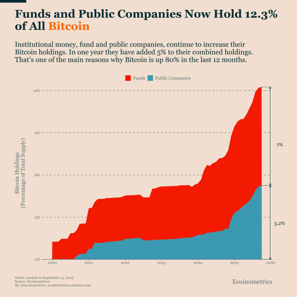ตามข้อมูลจากแพลตฟอร์มวิเคราะห์ Bitcoin อย่าง Ecoinometrics ชี้ว่า ในช่วง 12 เดือนที่ผ่านมา นักลงทุนสถาบันได้เข้าถือครอง Bitcoin เพิ่มขึ้นถึง 5% ซึ่งเป็นปัจจัยสำคัญที่ผลักดันให้ราคาของ Bitcoin ปรับตัวสูงขึ้นกว่า 80% ในช่วงเวลาเดียวกัน