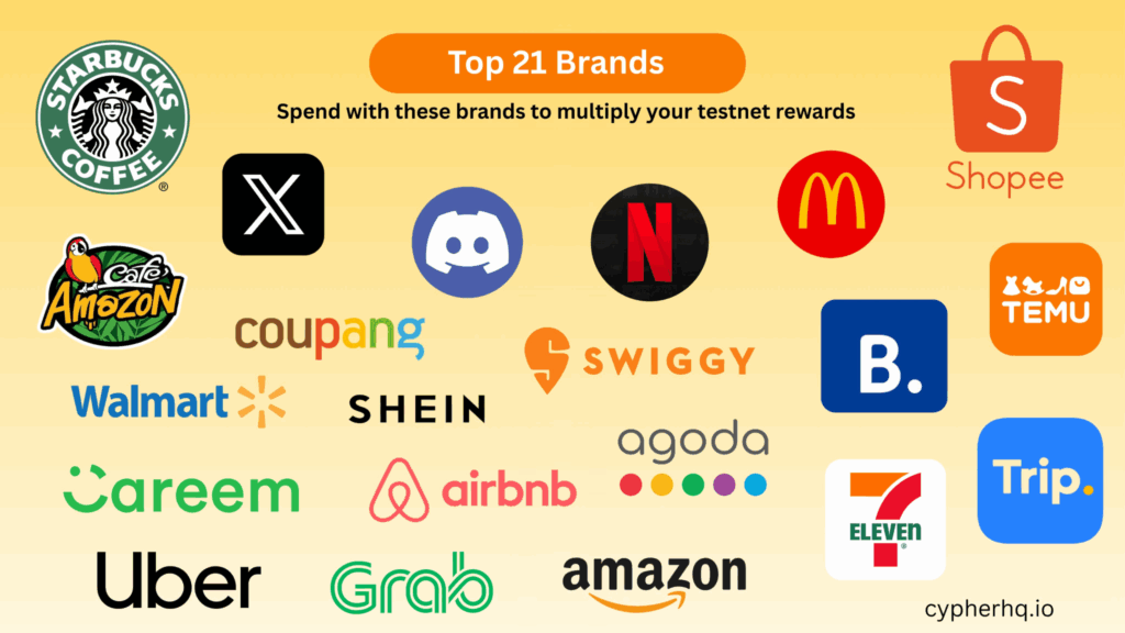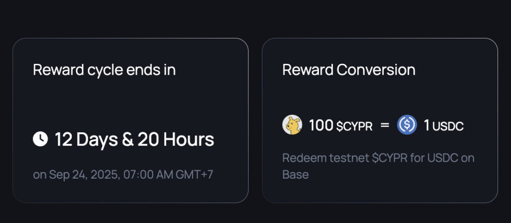 - แคมเปญใหญ่ แจกหนัก: ตอนนี้ Cypher จัดแคมเปญ Incentivized Testnet หรือ “ช่วงทดสอบที่แจกของรางวัล” โดยมีการแจกรางวัลเป็น 5,000,000 $CYPR มูลค่าประมาณ $50,000 ซึ่งวิธีการรับรางวัลก็ไม่ยุ่งยากเลยครับ แค่ใช้บัตรจ่ายตามปกติกับแบรนด์ดัง ๆ อย่าง Amazon, Starbucks, Shopee, Grab, Netflix, Mc Donalad, Airbnb, Booking, 7-Eleven หรือชวนเพื่อนมาใช้งานก็ได้แล้ว โดยอัตราแลกเปลี่ยนอยู่ที่ 100 $CYPR เท่ากับ 1 USDC