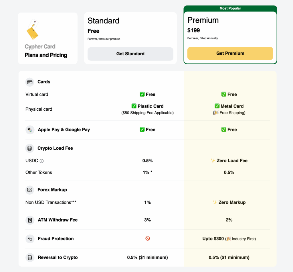 สำหรับค่าธรรมเนียมของบัตรจะแตกต่างกันไปตามแพ็กเกจที่คุณเลือก หากเป็นผู้ใช้แบบ Standard (ฟรี) คุณจะเสียค่าธรรมเนียมการโอนเหรียญ USDC มายังบัตรที่ 0.5% (เหรียญอื่น 1%) และเสียค่าธรรมเนียมการแปลงสกุลเงิน Forex Markup 1% เมื่อใช้จ่ายในประเทศที่ไม่ได้ใช้สกุลเงิน USD อย่างในประเทศไทย